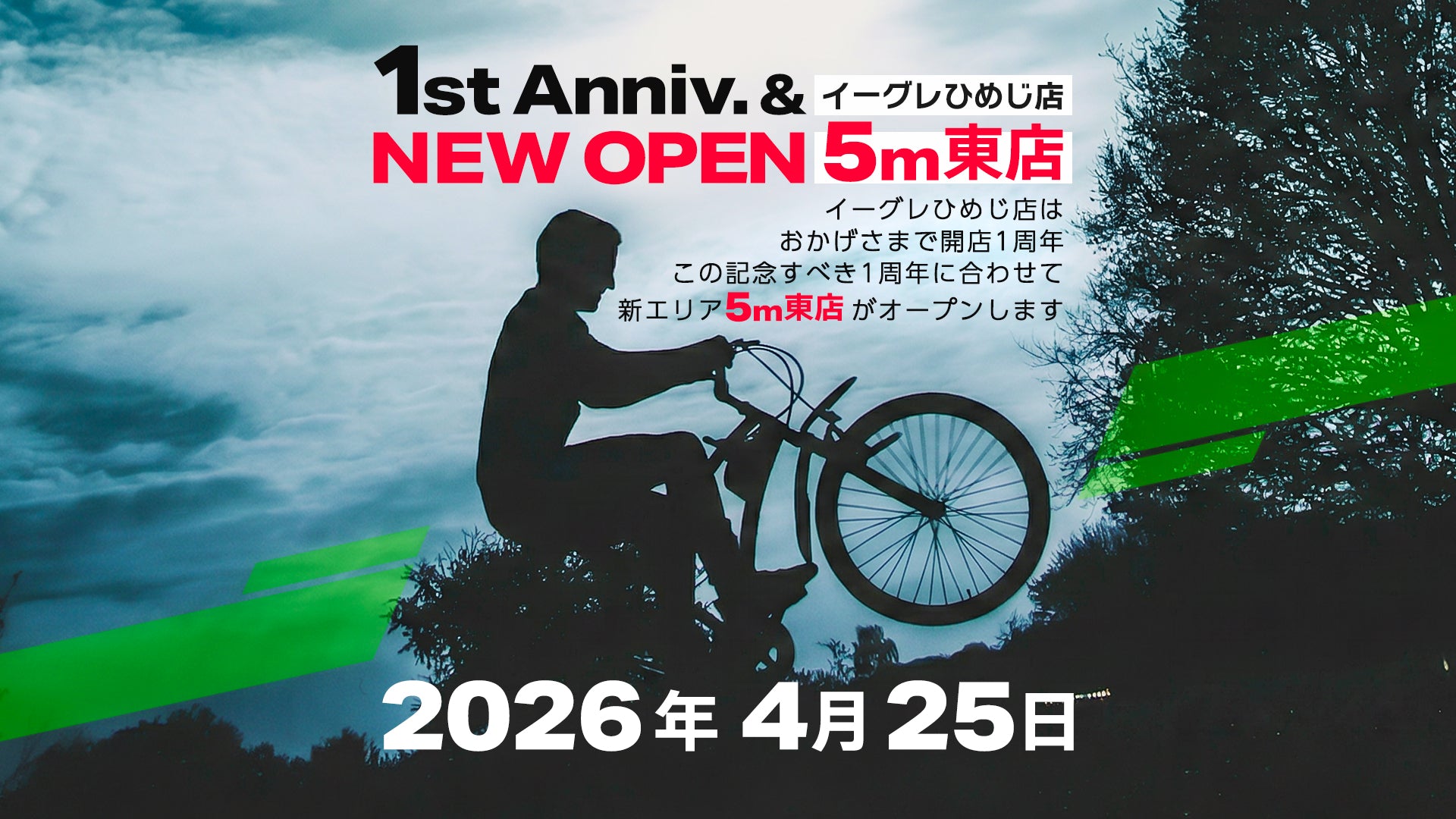 初のリアル店舗「ロックブロス イーグレひめじ店」は、2026年4月25日に、おかげさまで開店1周年を迎えます。この記念すべき1周年に合わせて、新エリア「5m東店」をオープンいたします。詳細はこちらからご確認ください