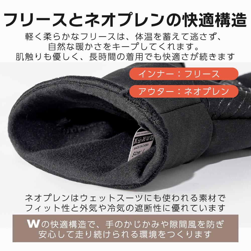 インナーに柔らかいフリース、アウターに冷気の遮断性に優れたネオプレンを使用