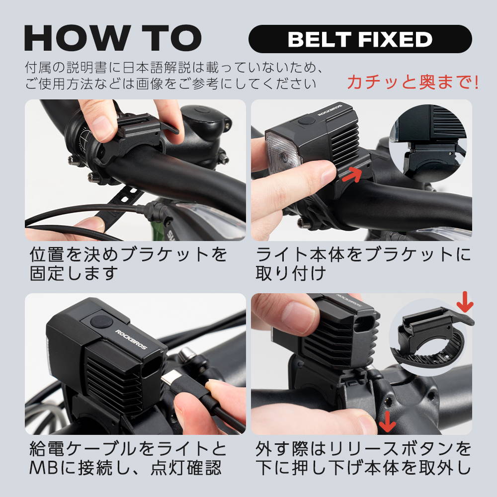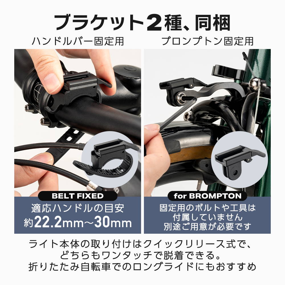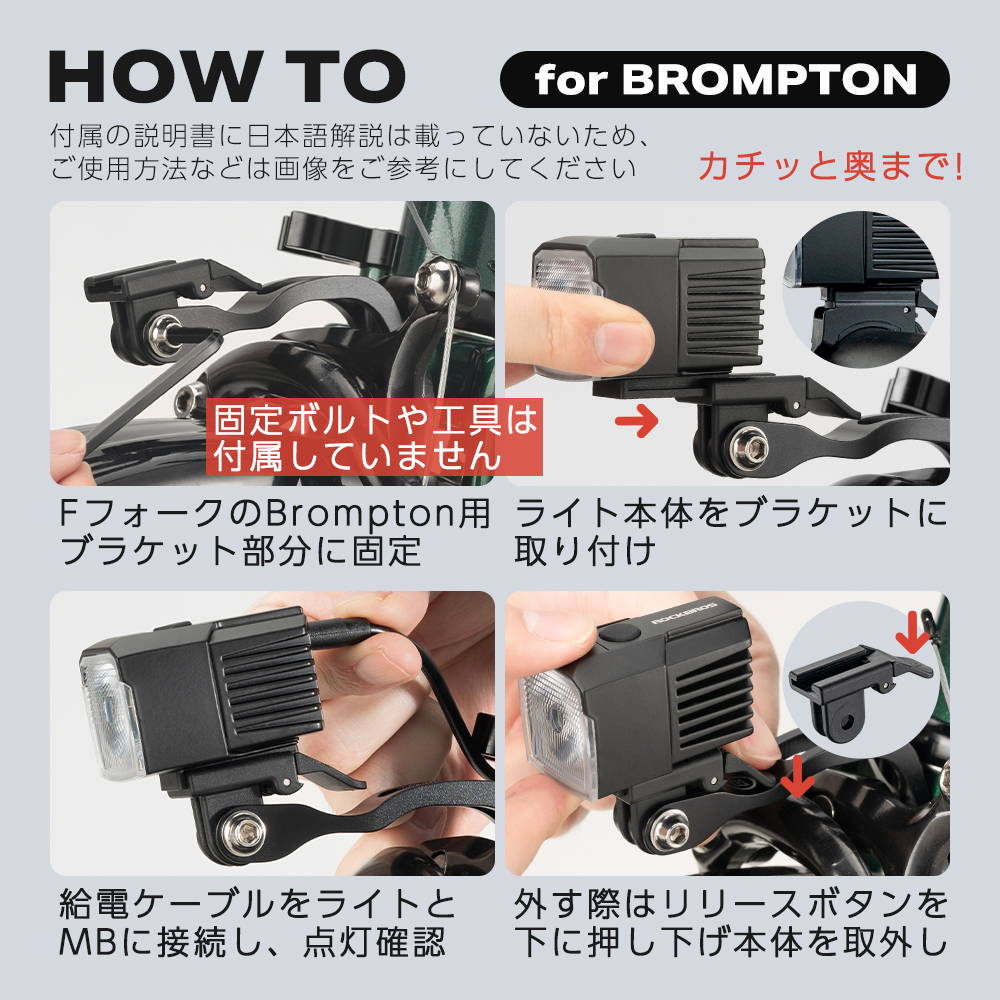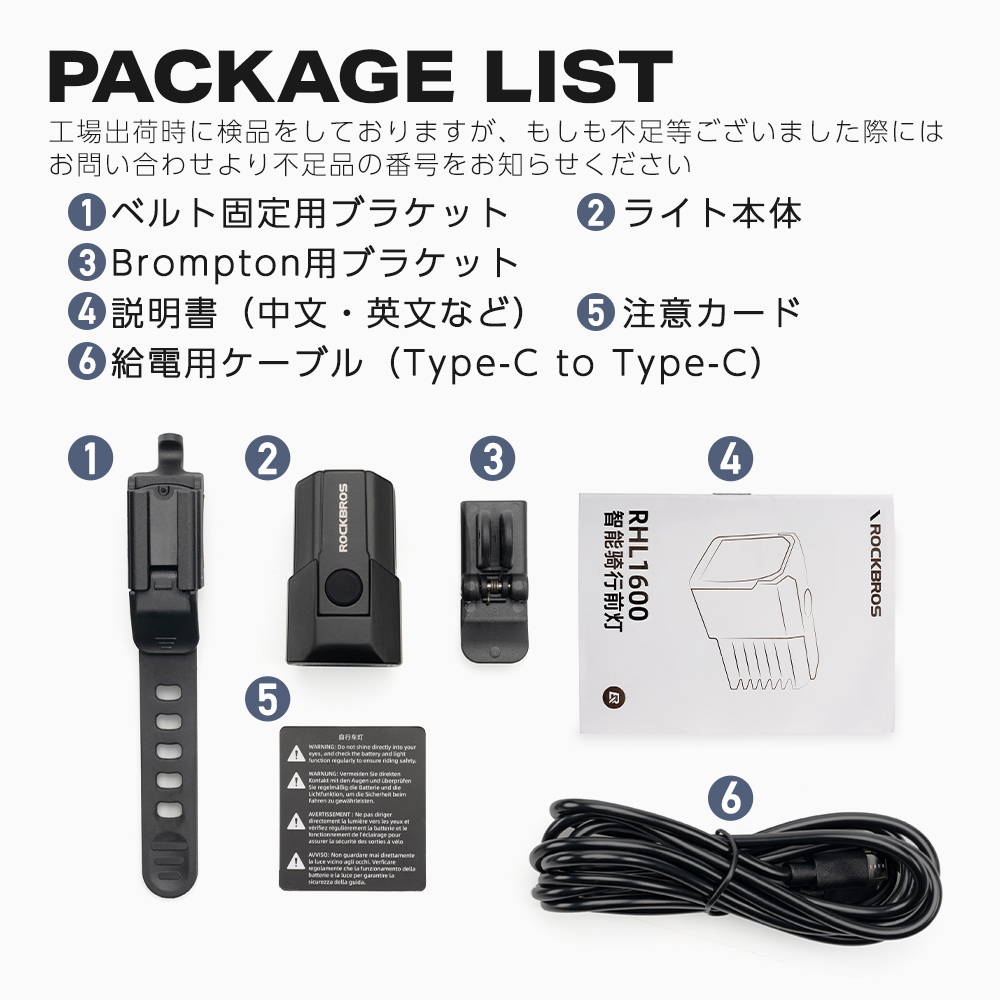 ハンドルブラケット(1)・Bromptonブラケット(1)・給電ケーブル Type-C to Type-C(1)・説明書(1)・注意カード(1)