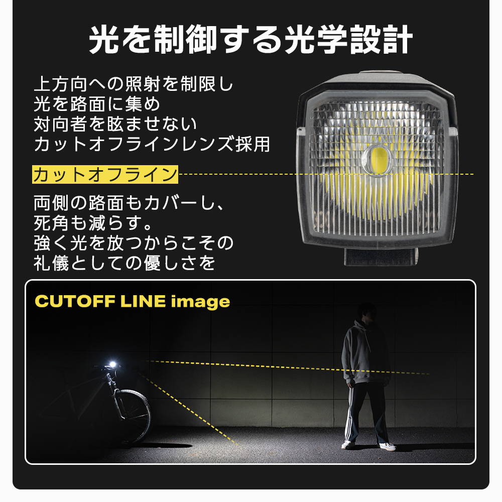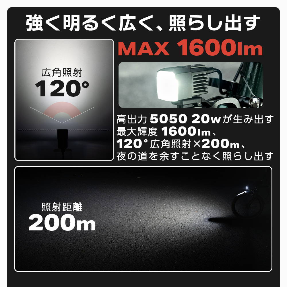 ・最大1600lm・120°広角照射・照射距離200m・カットオフラインレンズで対向者を眩ませない