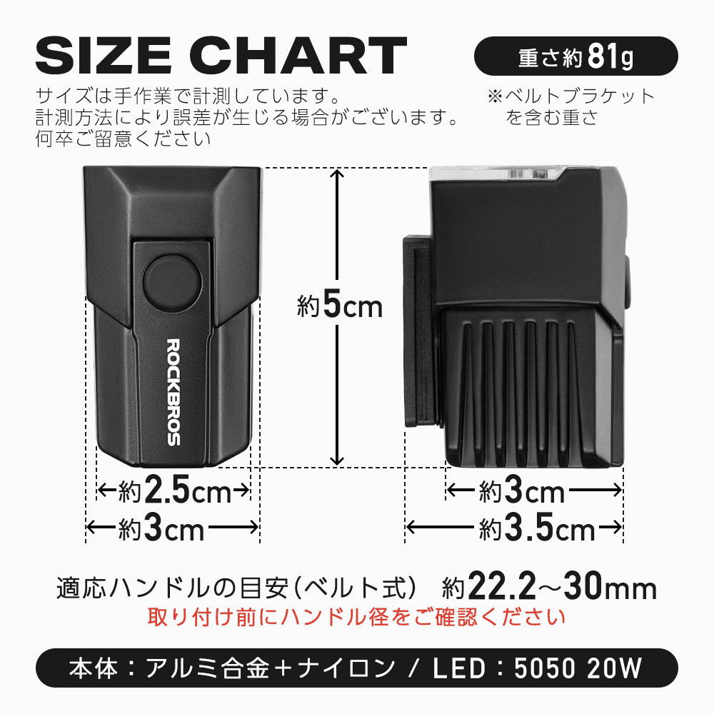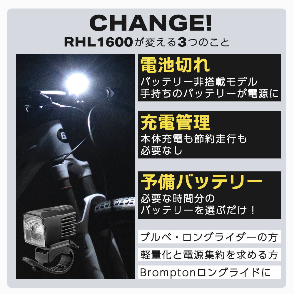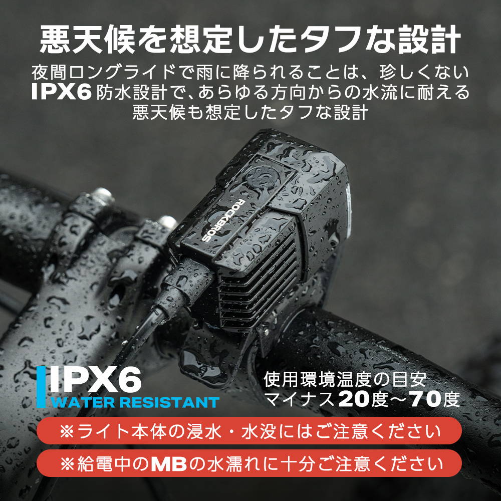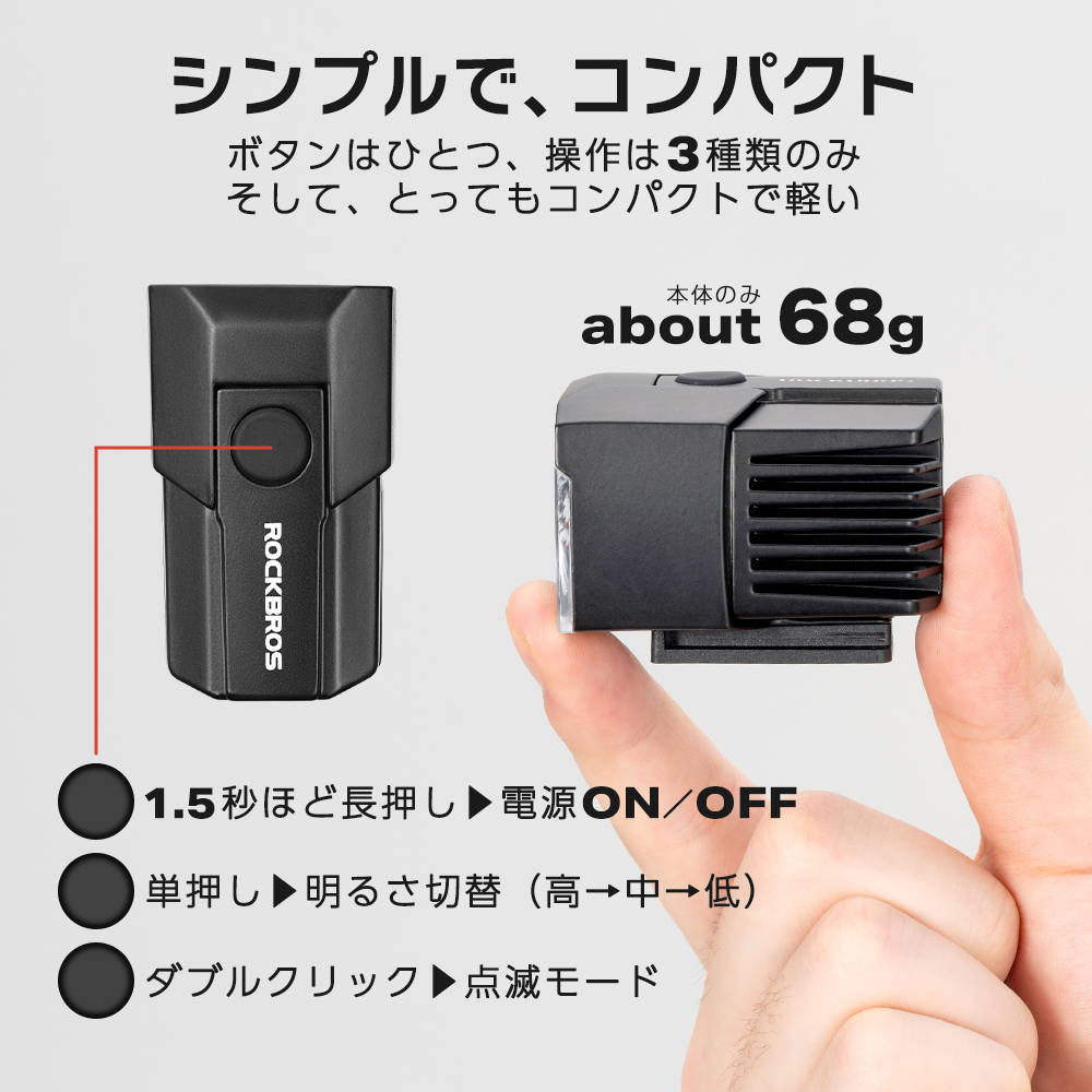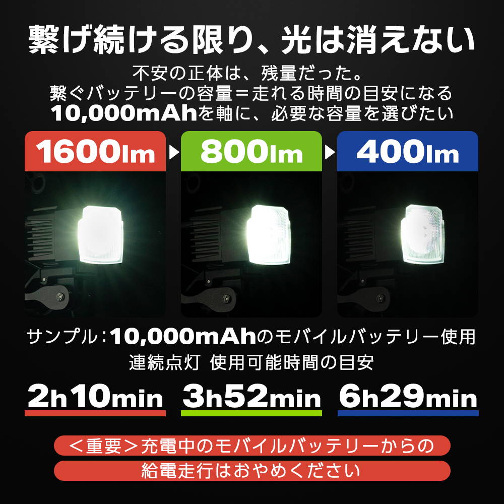 High 1600lm / Mid 800lm / Low 400lm + 点滅(ストロボ)