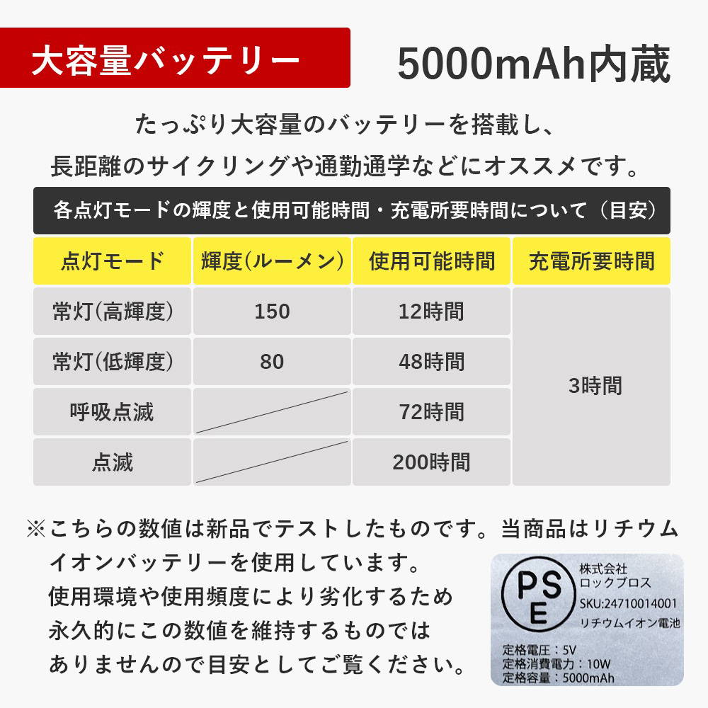 点灯時間の目安(常灯・高輝度)