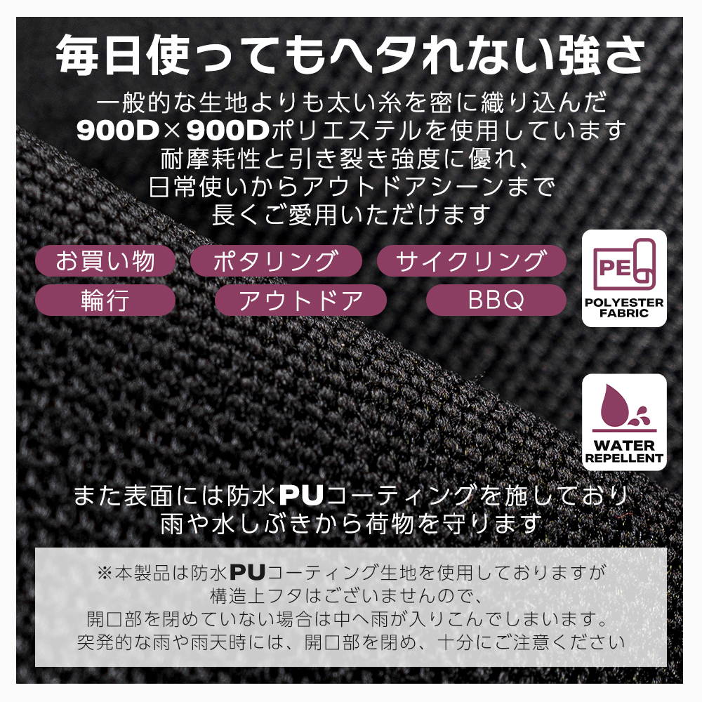 ・本製品は防水PUコーティング生地を使用しておりますが、構造上フタはございませんので、開口部を閉じていない場合は中へ雨が入りこんでしまいます。突発的な雨や雨天時には、開口部を閉め、十分にご注意ください