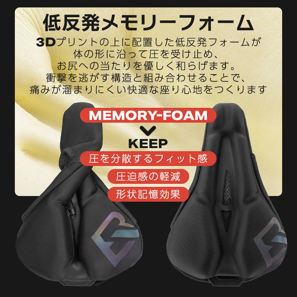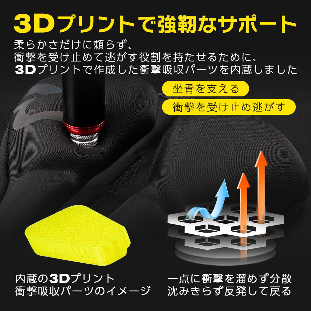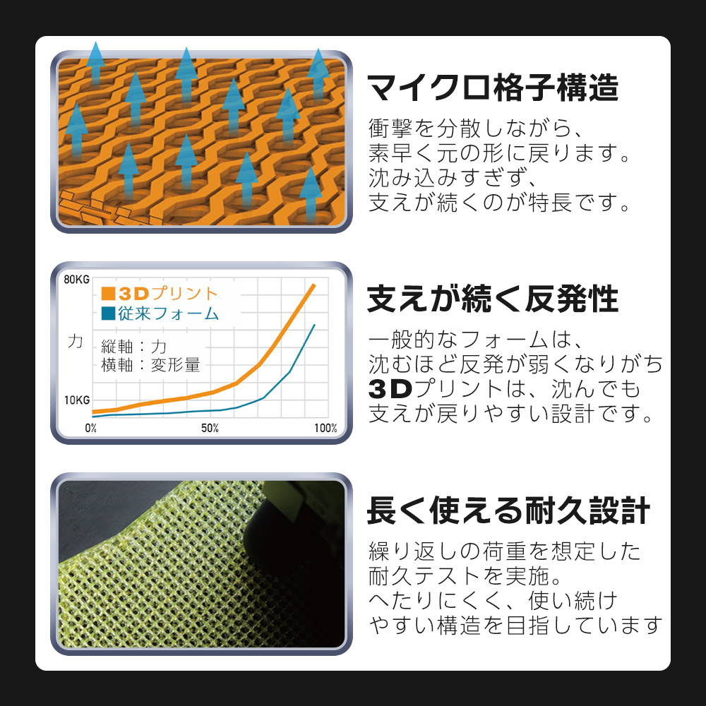 ・中材:低反発メモリーフォーム+3Dプリント衝撃吸収パーツ