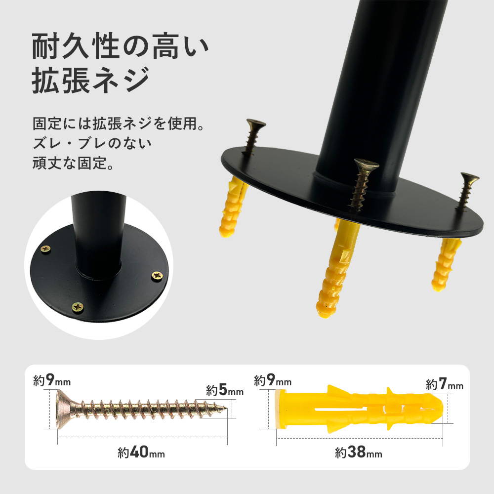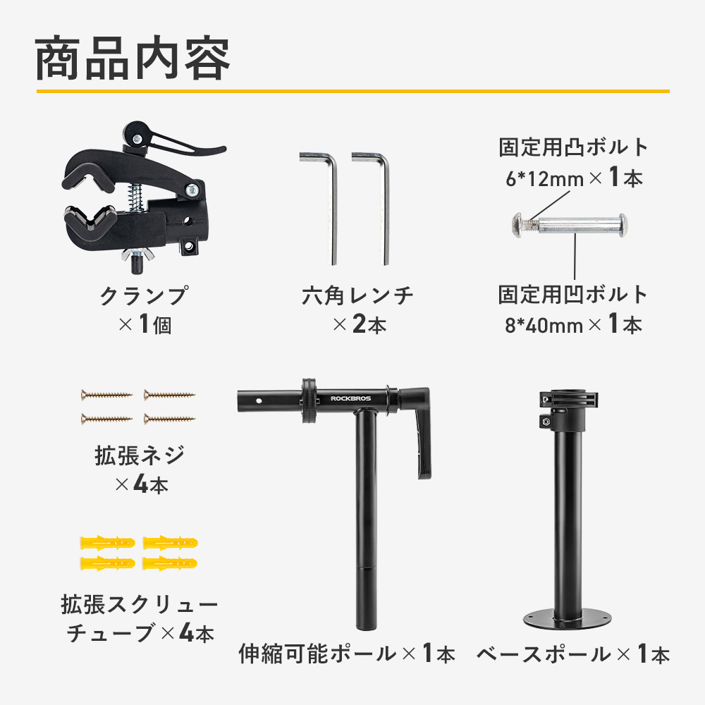 クランプ(1個)/ 六角レンチ(2本)/ 拡張スクリューチューブ(4本)/ 拡張ネジ(4本)/ 固定用凸ボルト( 6×12mm×1本 )/ 固定用凹ボルト(8×40mm×1本)/ 伸縮可能ポール(1本)/ ベースポール(1本)