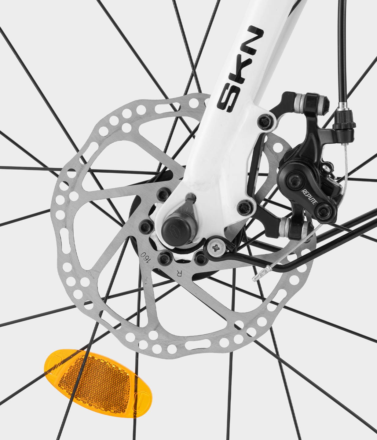 ワイヤー引き式ディスクブレーキを前後に搭載。リムブレーキと異なり、雨天や荷重時でも制動力が安定する