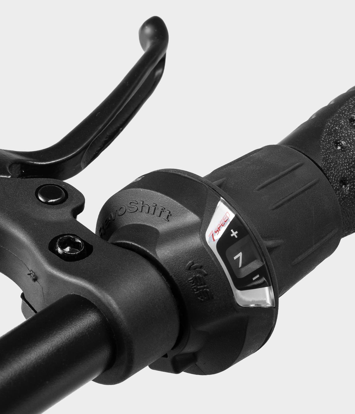 SHIMANO製グリップシフターを採用。インデックス機構により、7段変速が正確かつスムーズに切り替わる