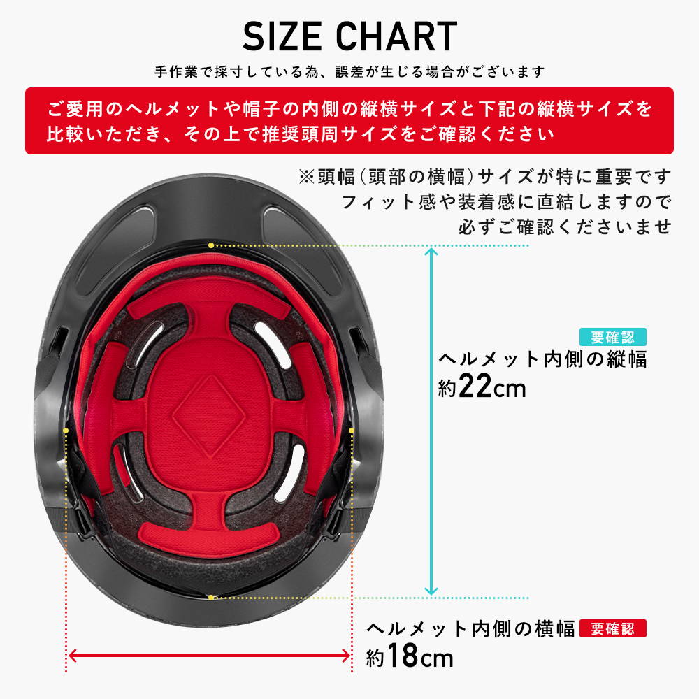 ※商品画像内のヘルメット内側の縦横サイズと、お手持ちのヘルメットや帽子の横幅・縦幅サイズと比較いただき、その上で推奨頭囲サイズをご確認ください