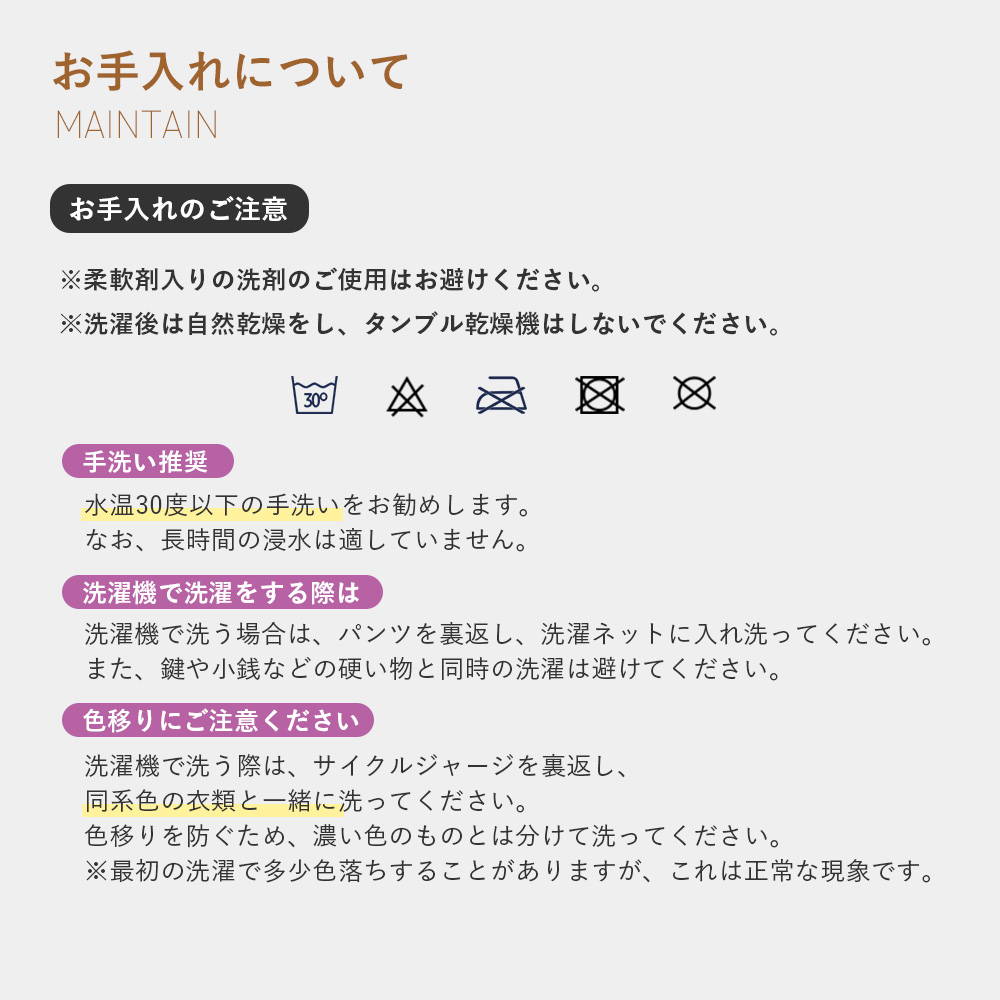 ・当商品は水温30度以下の手洗いをお勧めします。なお、長時間の浸け置きは避けてください